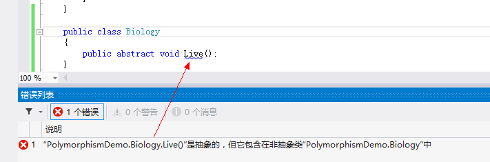 public abstract class Biology { public abstract void Live(); } public class Animal : Biology { public override void Live() { Console.WriteLine("Animal重写的抽象方法"); //throw new NotImplementedException(); } }注意:抽象方法只能在抽象类中定义,如果不在抽象类中定义,则会报出如下错误: