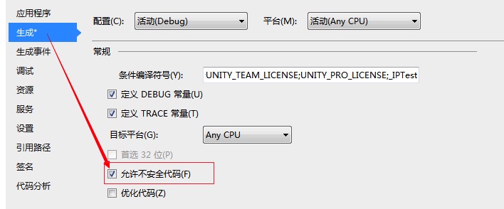 为了编译不安全代码,您必须切换到命令行编译器指定 /unsafe 命令行。