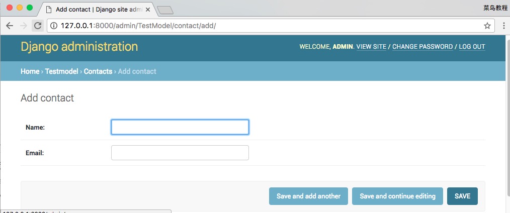 我们可以自定义管理页面,来取代默认的页面。比如上面的 "add" 页面。我们想只显示 name 和 email 部分。修改 TestModel/admin.py: