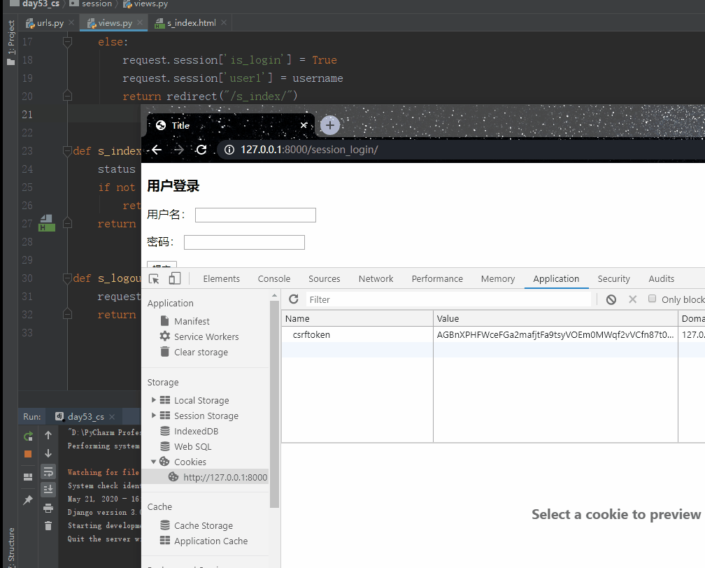 d. 浏览器第三次请求其他资源时,携带 cookie :{sessionid:随机字符串},服务器从 django.session 表中根据该随机字符串取出该用户的数据,供其使用(即保存状态)。