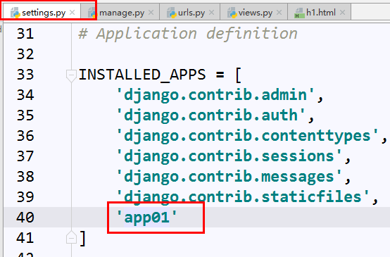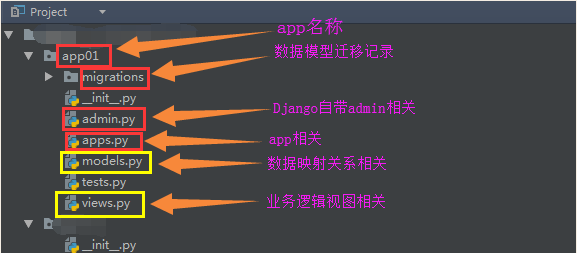 注意:使用命令行创建的应用,一定要在 settings.py-->INSTALLED_APPS 中加入你的应用名字进行注册, 使用Pycharm创建的应用则不用。 认识应用结构