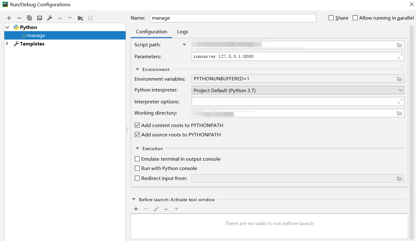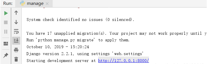 配置完以上信息之后,直接按 Ctrl+shift+F10 运行一下 manage.py 文件。
