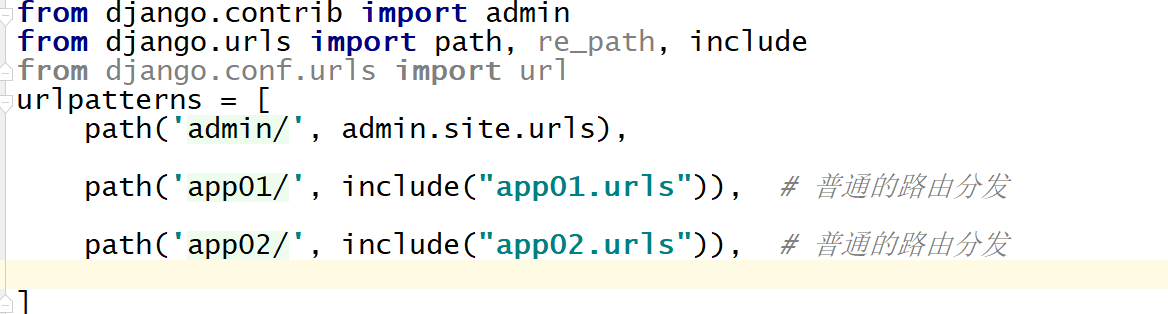 - 2、在项目名称目录下的 urls 文件里,统一将路径分发给各个 app 目录。