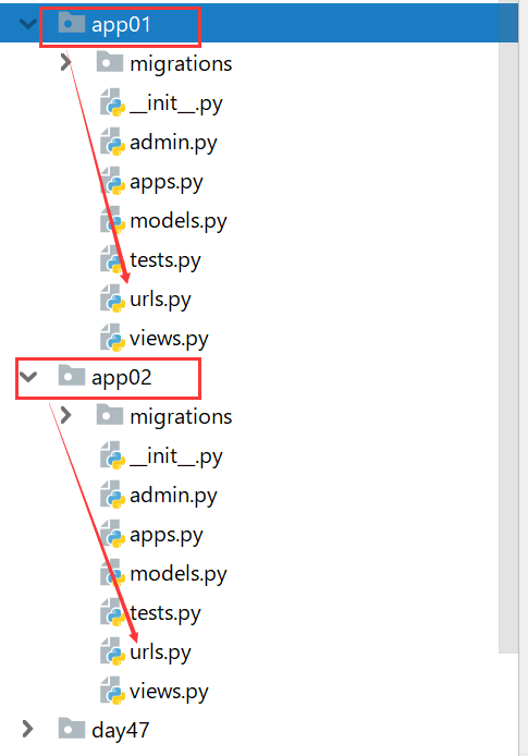 在各自 app 目录下,写自己的 urls.py 文件,进行路径跳转。