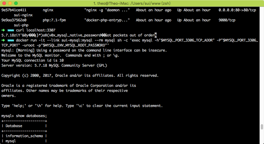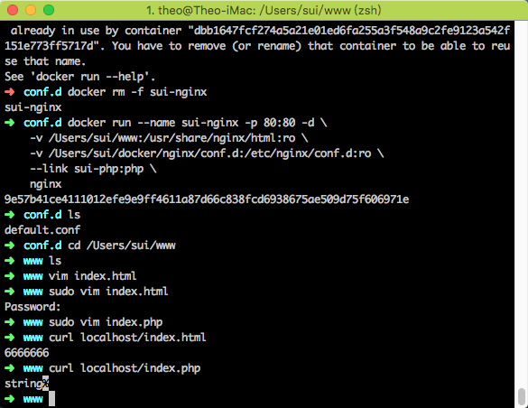 docker run --name sui-nginx -p 80:80 -d \ -v /Users/sui/www:/usr/share/nginx/html:ro \ -v /Users/sui/docker/nginx/conf.d:/etc/nginx/conf.d:ro \ --link sui-php:php \ nginx测试结果