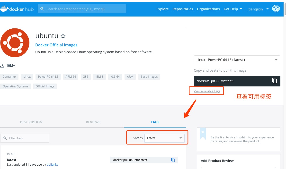 可以通过 Sort by 查看其他版本的 Ubuntu。默认是最新版本 ubuntu:latest 。