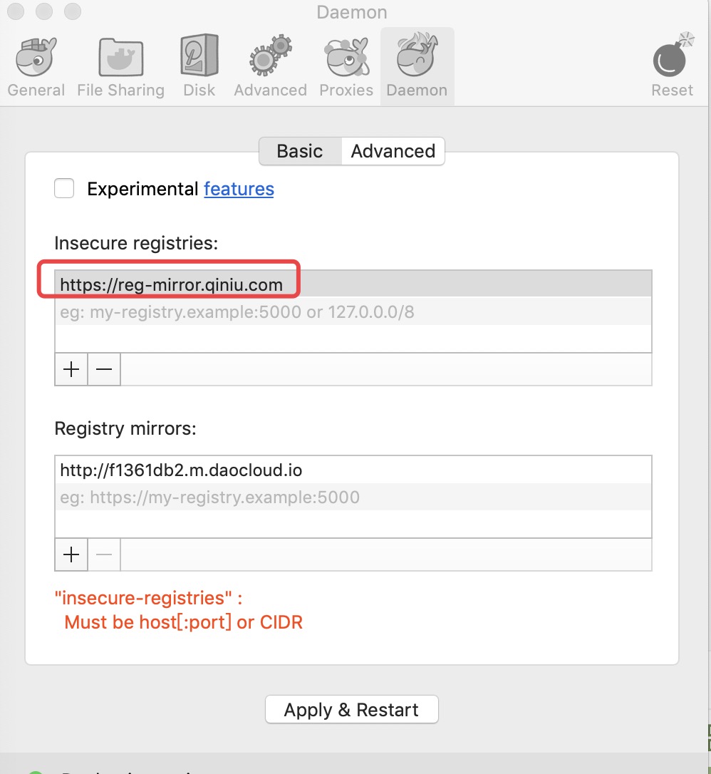 对于使用 Mac OS X 的用户,在任务栏点击 Docker for mac 应用图标-> Perferences...-> Daemon-> Registrymirrors。在列表中填写加速器地址 https://reg-mirror.qiniu.com 。修改完成之后,点击 Apply&Restart 按钮,Docker 就会重启并应用配置的镜像地址了。