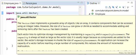 java 编辑器中将鼠标指针移至类上,将显示与该类相关的java文档信息。
