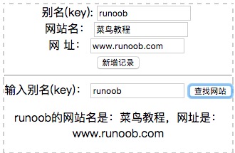 - 使用 key="sitename" 和 value="菜鸟教程" 创建一个 localStorage 键/值对。