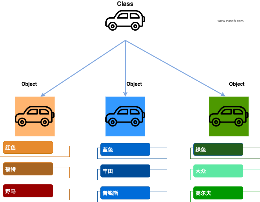 下图中汽车为类(class),而具体的每辆车为该汽车类的对象(object),对象包含了汽车的颜色、品牌、名称等。