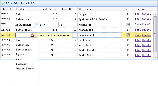 可编辑的功能是最近添加到数据网格(datagrid)的。它可以使用户添加一个新行到数据网格(datagrid)。用户也可以更新一个或多个行。
