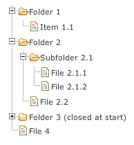 <ul id="browser" class="filetree treeview-famfamfam"> <li><span class="folder">Folder 1</span> <ul> <li><span class="folder">Item 1.1</span> <ul> <li><span class="file">Item 1.1.1</span></li> </ul> </li> <li><span class="folder">Folder 2</span> <ul> <li><span class="folder">Subfolder 2.1</span> <ul id="folder21"> <li><span class="file">File 2.1.1</span></li> <li><span class="file">File 2.1.2</span></li> </ul> </li> <li><span class="folder">Subfolder 2.2</span> <ul> <li><span class="file">File 2.2.1</span></li> <li><span class="file">File 2.2.2</span></li> </ul> </li> </ul> </li> <li class="closed"><span class="folder">Folder 3 (closed at start)</span> <ul> <li><span class="file">File 3.1</span></li> </ul> </li> <li><span class="file">File 4</span></li> </ul> </li> </ul>