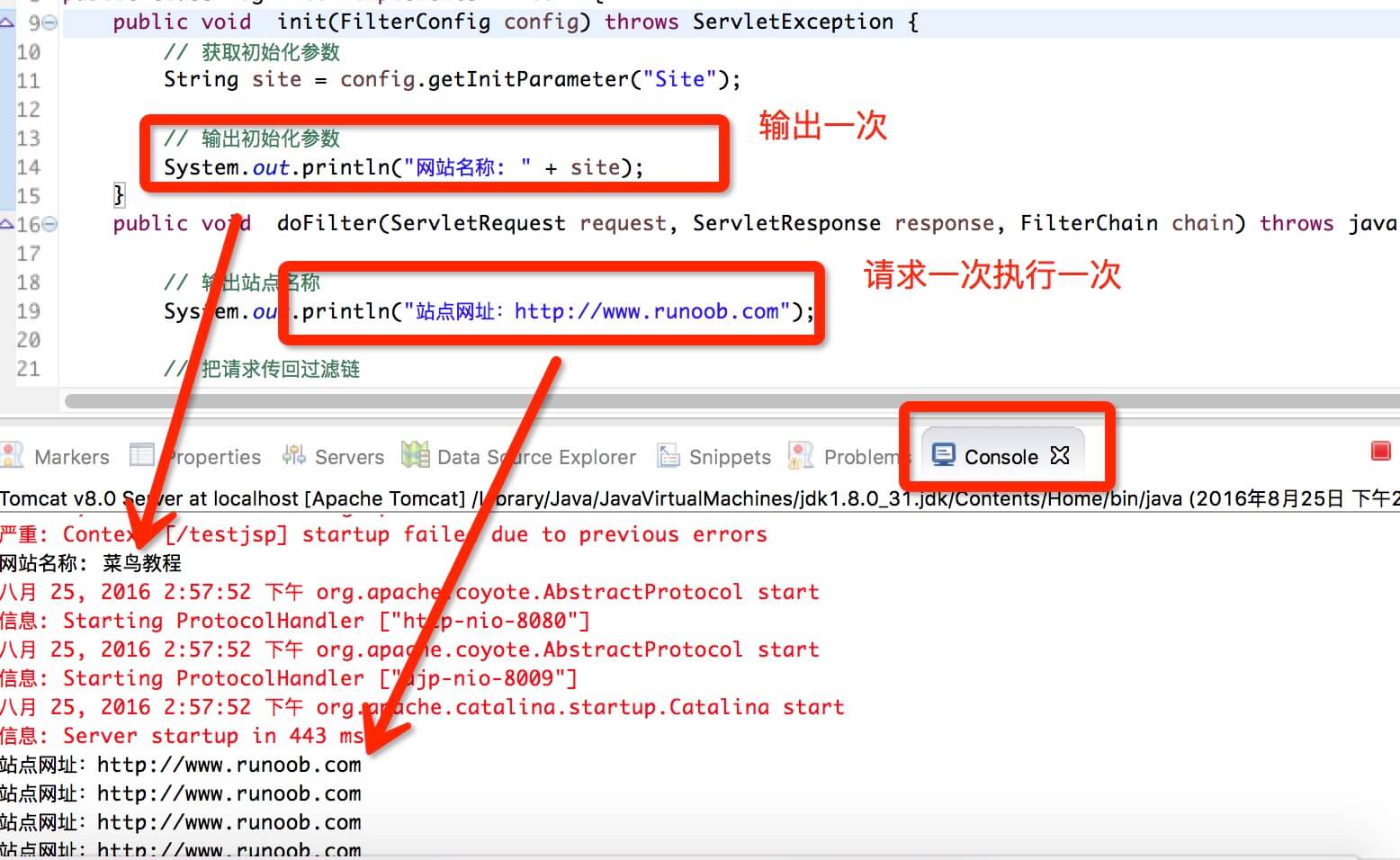 <filter> <filter-name>LogFilter</filter-name> <filter-class>com.runoob.test.LogFilter</filter-class> <init-param> <param-name>Site</param-name> <param-value>菜鸟教程</param-value> </init-param> </filter>