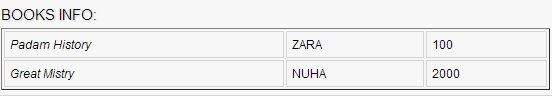 <books> <book> <name>Padam History</name> <author>ZARA</author> <price>100</price> </book> <book> <name>Great Mistry</name> <author>NUHA</author> <price>2000</price> </book> </books>