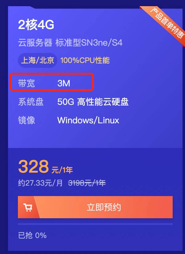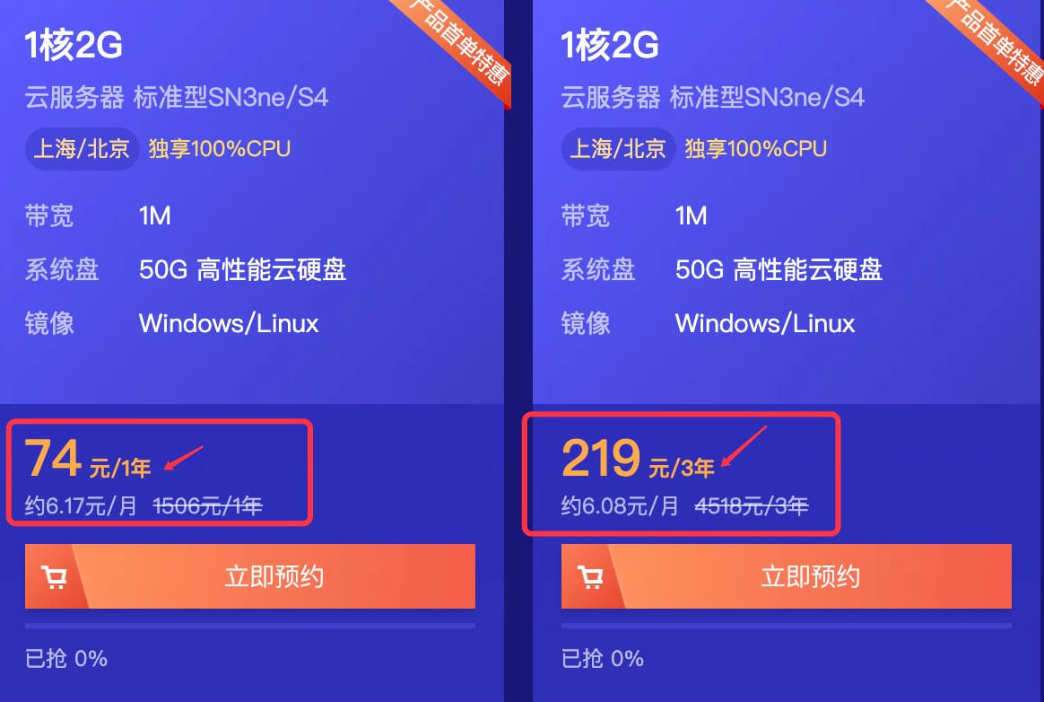 - 2、2核4G 带宽 1 年 74(有流量限制,原价:1680元)。