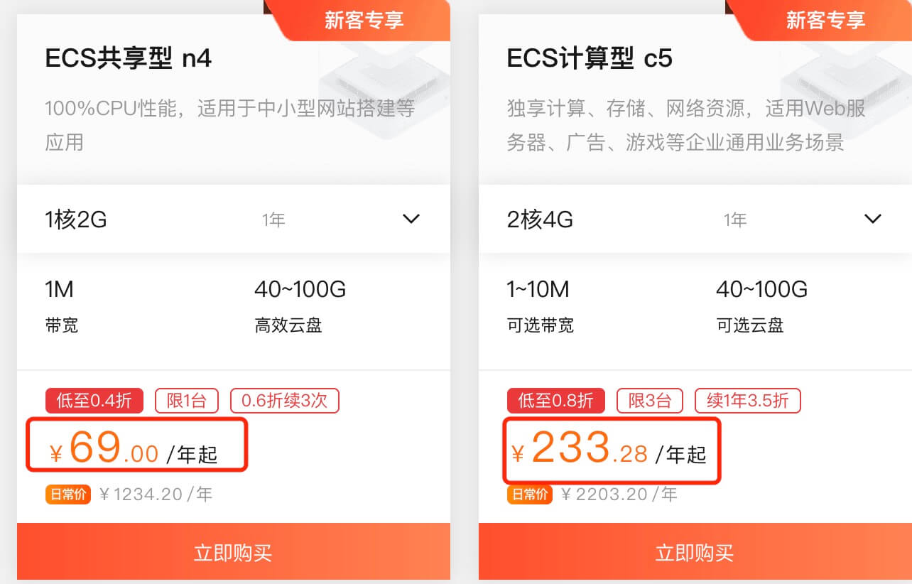 阿里云新用户购买折扣比较大,1核2G,38/年起,2核4G,179/年起,点击下面图片查看详情。
