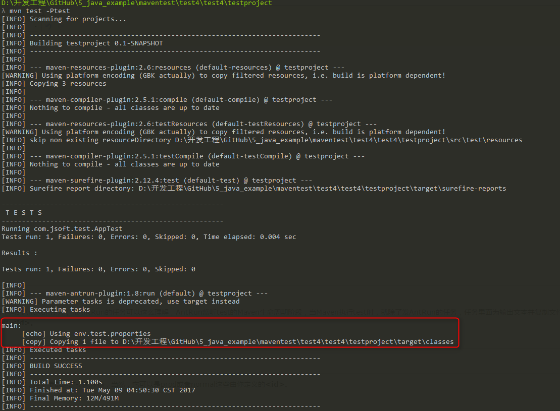 提示 1:此时不需要使用 -Ptest 来输入参数了,上面的 setting.xml 文件的 <activeprofile> 已经指定了 test 参数代替了。