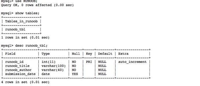 root@host# mysql -u root -p Enter password:******* mysql> use RUNOOB; Database changed mysql> CREATE TABLE runoob_tbl( -> runoob_id INT NOT NULL AUTO_INCREMENT, -> runoob_title VARCHAR(100) NOT NULL, -> runoob_author VARCHAR(40) NOT NULL, -> submission_date DATE, -> PRIMARY KEY ( runoob_id ) -> )ENGINE=InnoDB DEFAULT CHARSET=utf8; Query OK, 0 rows affected (0.16 sec) mysql>