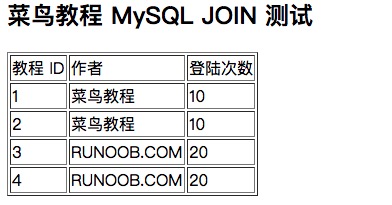 echo '<h2>菜鸟教程 MySQL JOIN 测试<h2>';