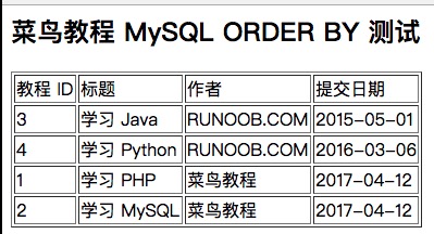 echo '<h2>菜鸟教程 MySQL ORDER BY 测试<h2>';
