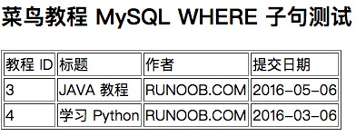 echo '<h2>菜鸟教程 MySQL WHERE 子句测试<h2>';