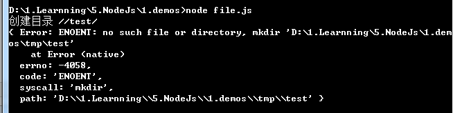 console.log("创建目录 //test/"); fs.mkdir("./tmp/test/",function(err){ if (err) { return console.error(err); } console.log("目录创建成功。"); });然后运行抛出异常(no such file or directory,mkdir...)如下: