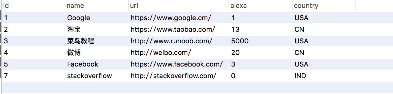 这里我们在 MySQL 数据库创建 RUNOOB 数据库,数据表为 Websites,表结构及数据如下图所示:
