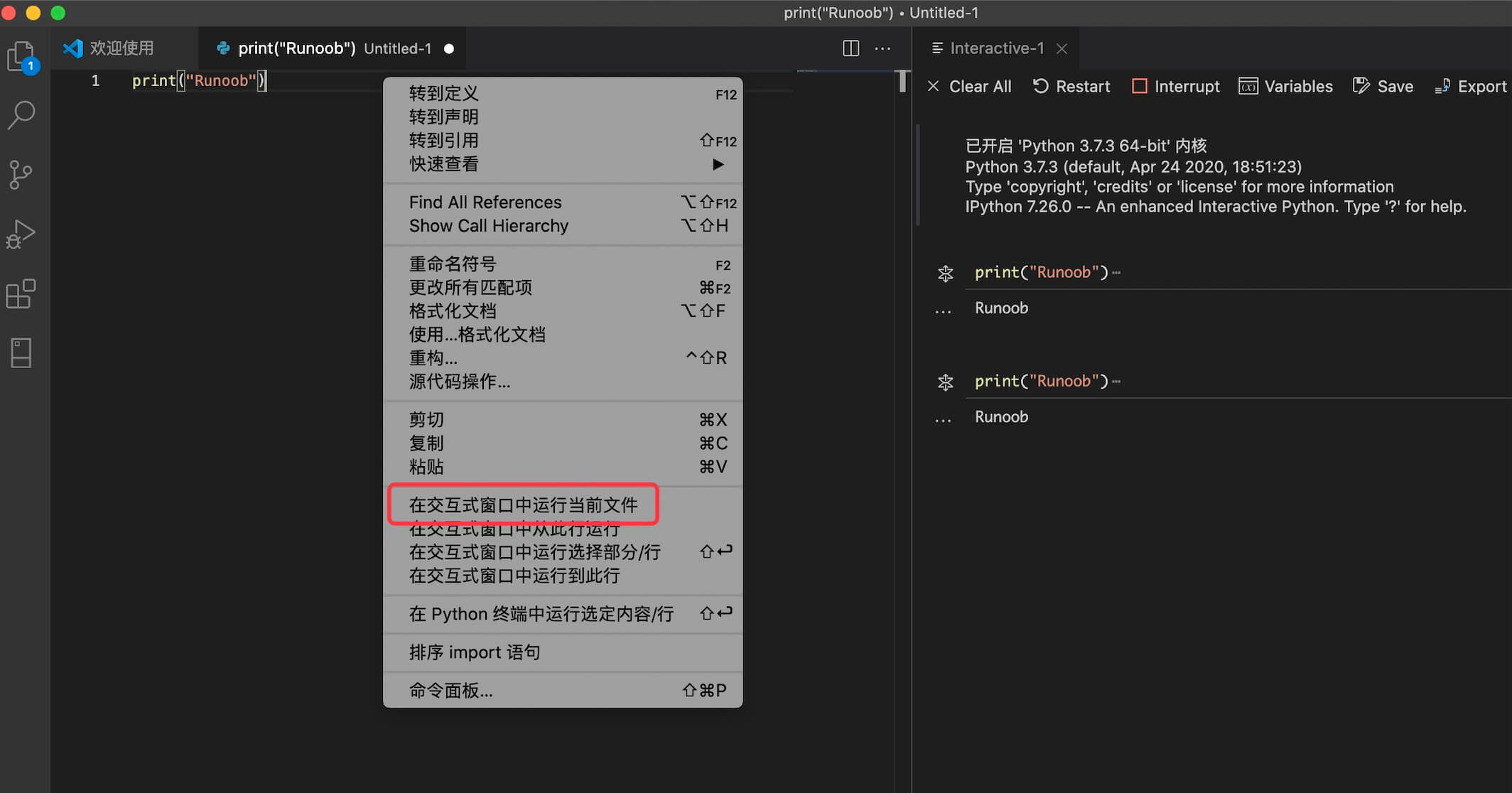 右击鼠标,选择在交互式窗口运行文件,如果有提示需要安装扩展,直接点安装即可(没有安装会一直显示在连接 Python 内核):