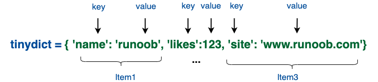 tinydict = {'name': 'runoob', 'likes': 123, 'url': 'www.runoob.com'}