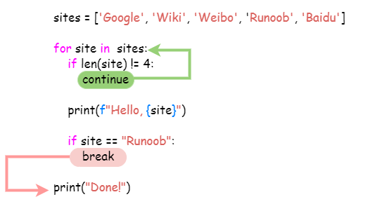 break 语句可以跳出 for 和 while 的循环体。如果你从 for 或 while 循环中终止,任何对应的循环 else 块将不执行。