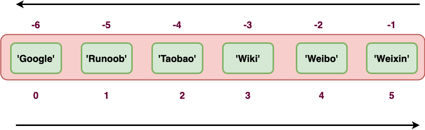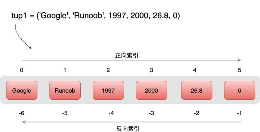 >>> tup = ('Google', 'Runoob', 'Taobao', 'Wiki', 'Weibo','Weixin')