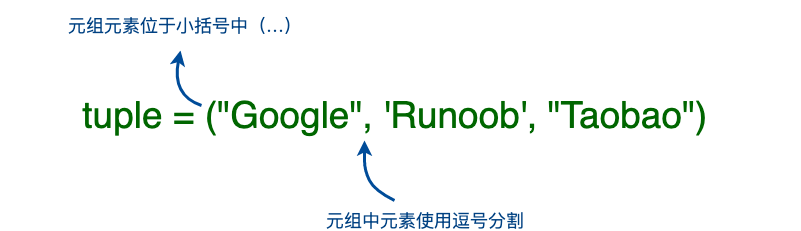 >>> tuple1 = ('Google', 'Runoob', 'Taobao')