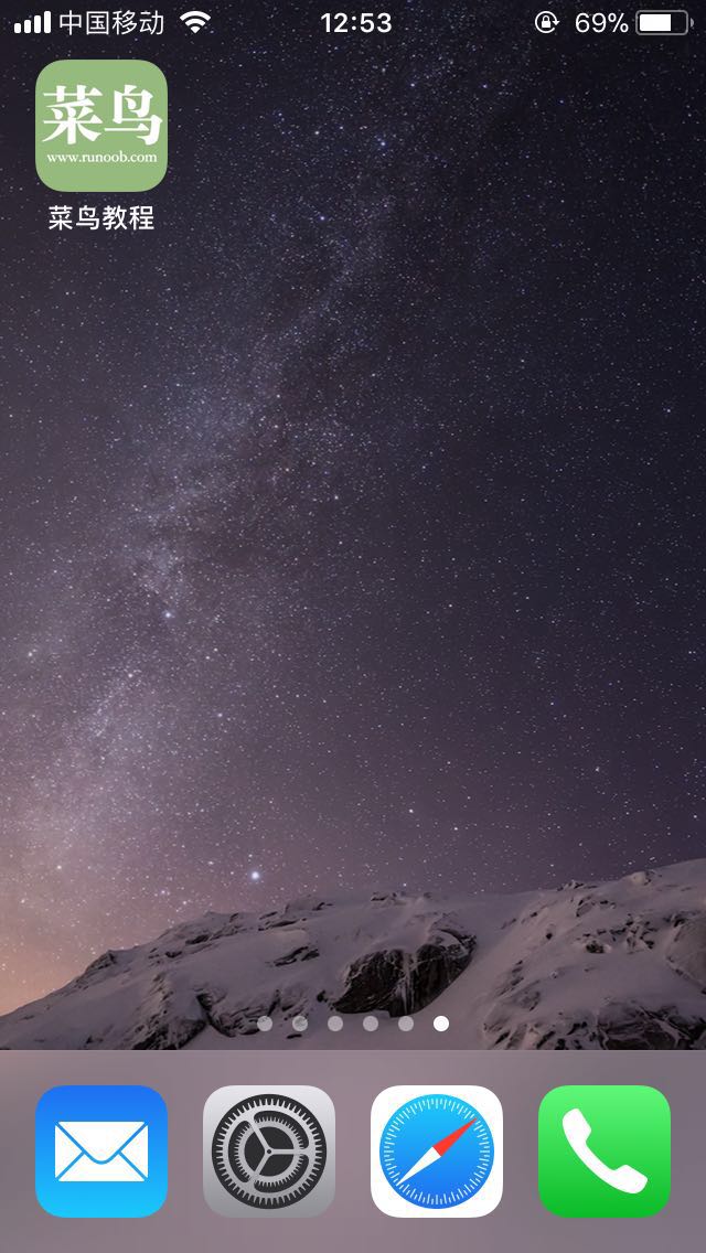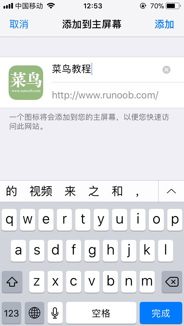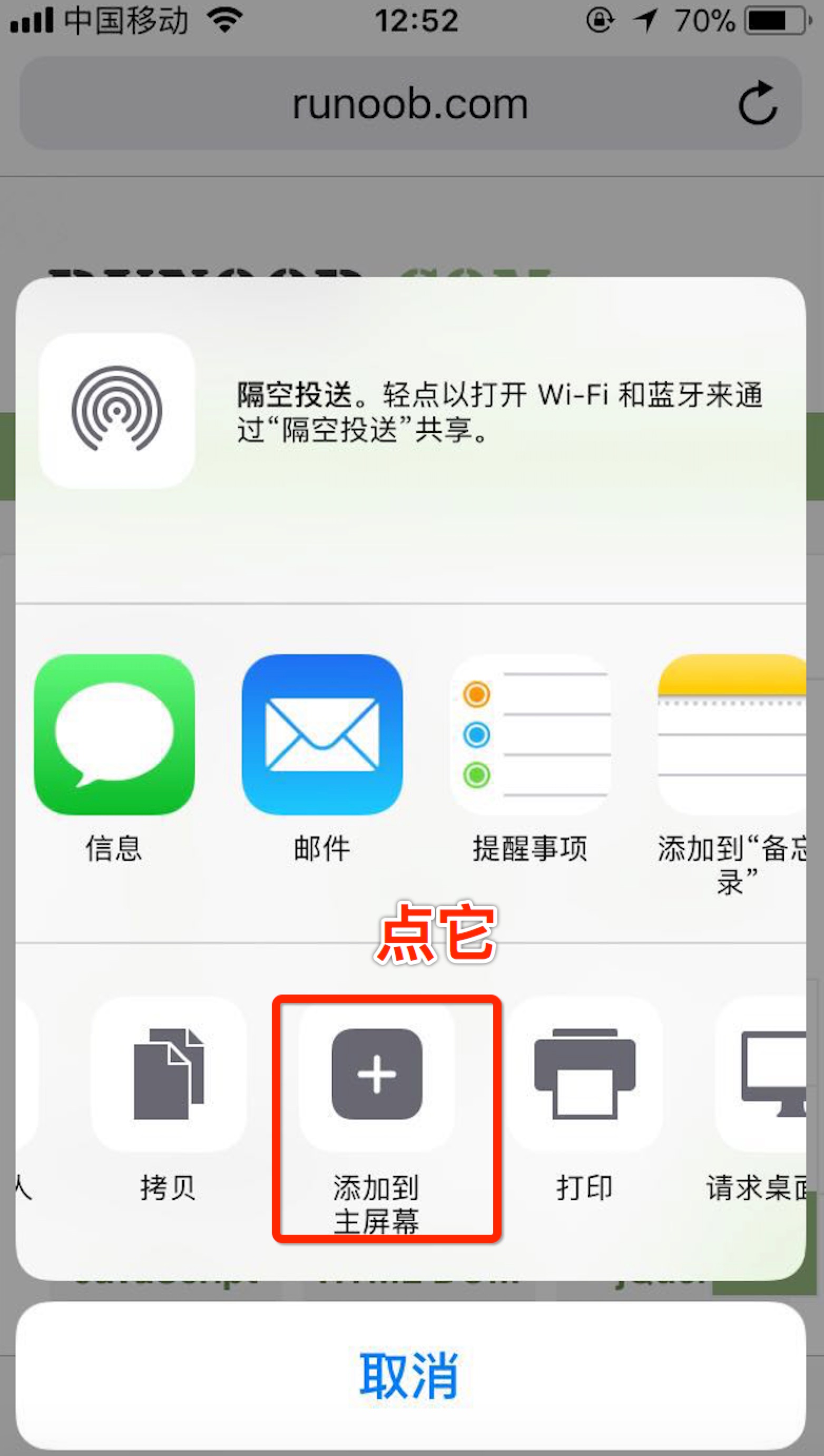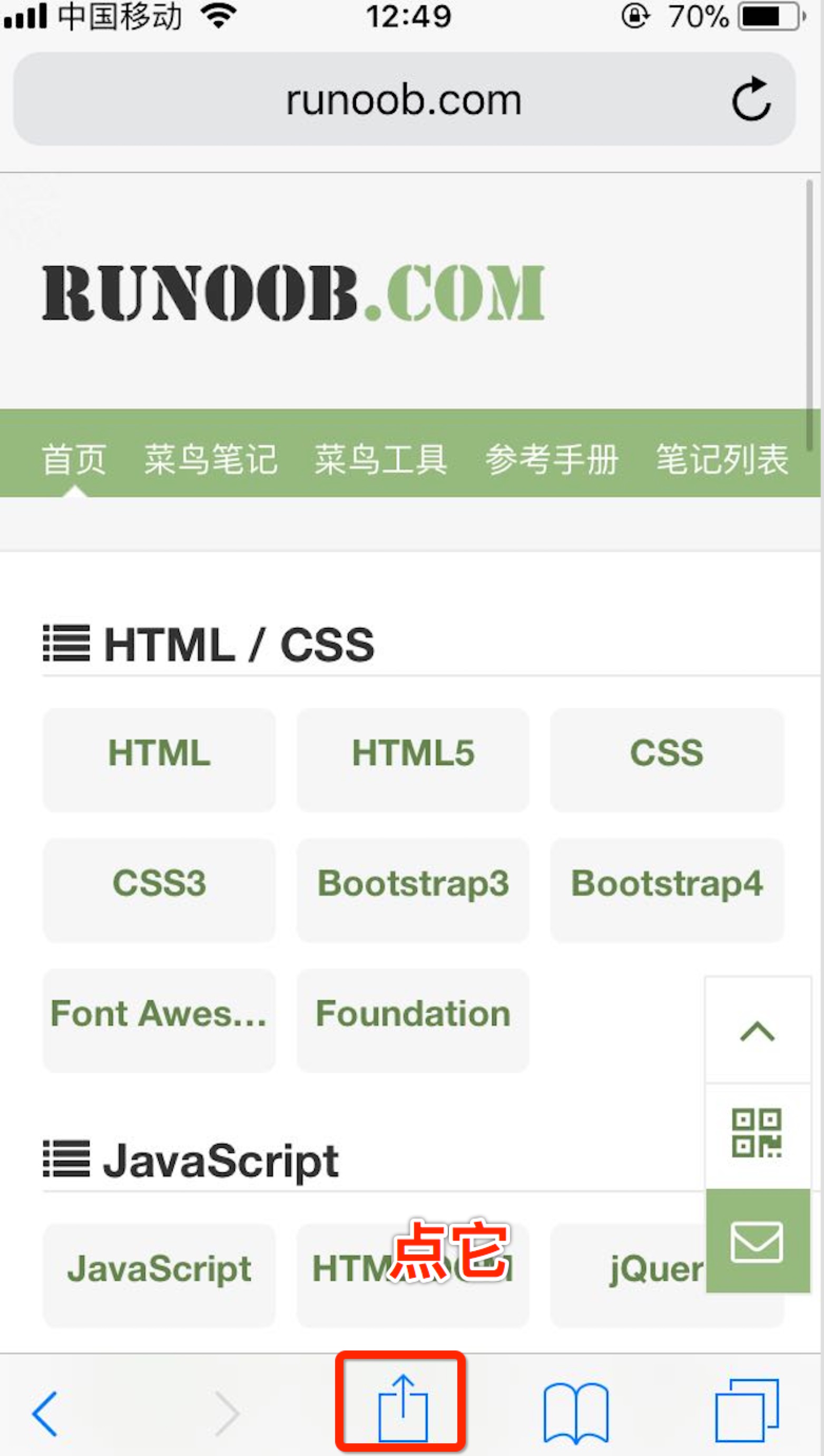 iOS 用户可以通过 Safari 浏览器来保存我们到应用到首页屏幕上,具体操作如下,在 Safari 浏览器中打开我们的官网 https://www.runoob.com 点击分享按钮: