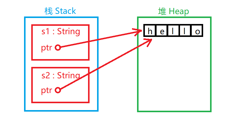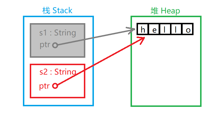 这里是真的将堆中的 "hello" 复制了一份,所以 s1 和 s2 都分别绑定了一个值,释放的时候也会被当作两个资源。