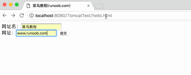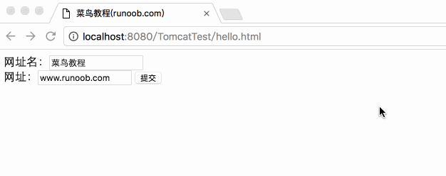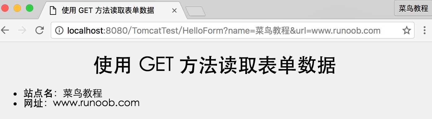 http://localhost:8080/TomcatTest/HelloForm?name=菜鸟教程&url=www.runoob.com