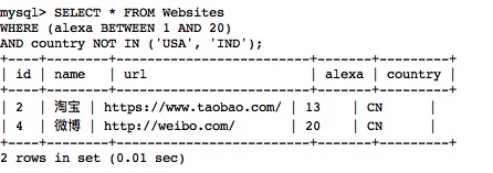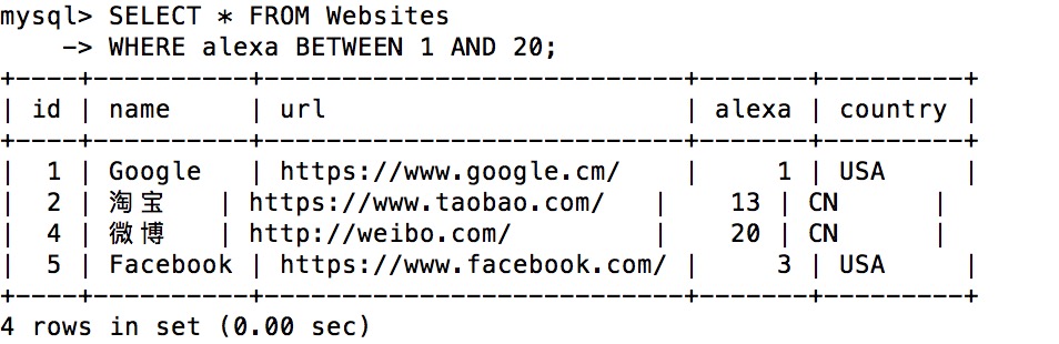 mysql> SELECT * FROM Websites; +----+---------------+---------------------------+-------+---------+ | id | name | url | alexa | country | +----+---------------+---------------------------+-------+---------+ | 1 | Google | https://www.google.cm/ | 1 | USA | | 2 | 淘宝 | https://www.taobao.com/ | 13 | CN | | 3 | 菜鸟教程 | http://www.runoob.com/ | 5000 | USA | | 4 | 微博 | http://weibo.com/ | 20 | CN | | 5 | Facebook | https://www.facebook.com/ | 3 | USA | | 7 | stackoverflow | http://stackoverflow.com/ | 0 | IND | +----+---------------+---------------------------+-------+---------+