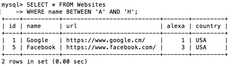 下面的 SQL 语句选取 name 以介于 'A' 和 'H' 之间字母开始的所有网站: