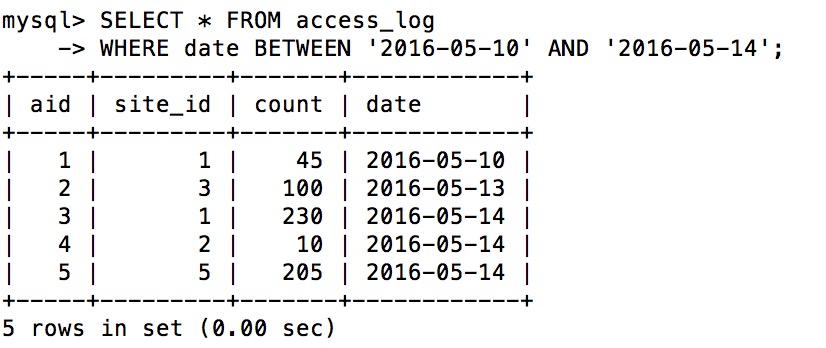 mysql> SELECT * FROM access_log; +-----+---------+-------+------------+ | aid | site_id | count | date | +-----+---------+-------+------------+ | 1 | 1 | 45 | 2016-05-10 | | 2 | 3 | 100 | 2016-05-13 | | 3 | 1 | 230 | 2016-05-14 | | 4 | 2 | 10 | 2016-05-14 | | 5 | 5 | 205 | 2016-05-14 | | 6 | 4 | 13 | 2016-05-15 | | 7 | 3 | 220 | 2016-05-15 | | 8 | 5 | 545 | 2016-05-16 | | 9 | 3 | 201 | 2016-05-17 | +-----+---------+-------+------------+ 9 rows in set (0.00 sec)