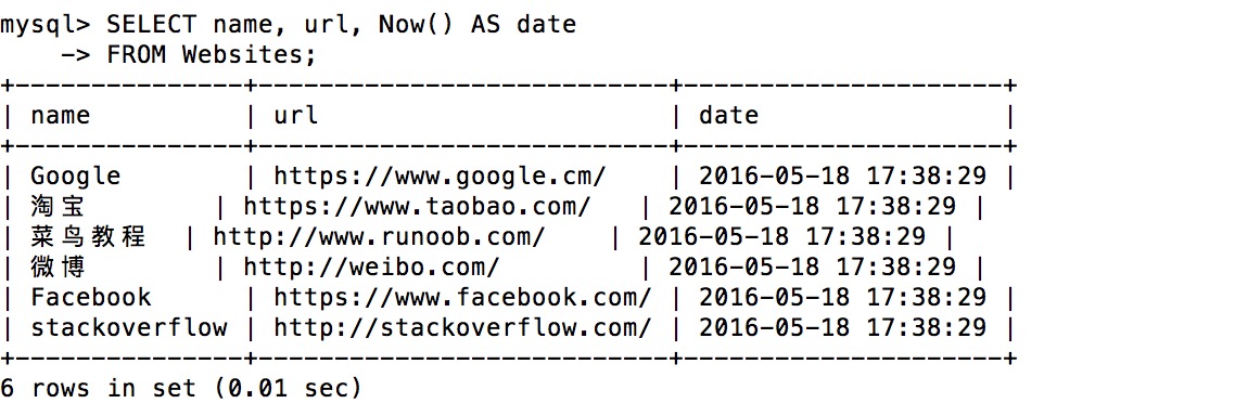 +----+--------------+---------------------------+-------+---------+ | id | name | url | alexa | country | +----+--------------+---------------------------+-------+---------+ | 1 | Google | https://www.google.cm/ | 1 | USA | | 2 | 淘宝 | https://www.taobao.com/ | 13 | CN | | 3 | 菜鸟教程 | http://www.runoob.com/ | 4689 | CN | | 4 | 微博 | http://weibo.com/ | 20 | CN | | 5 | Facebook | https://www.facebook.com/ | 3 | USA | | 7 | stackoverflow | http://stackoverflow.com/ | 0 | IND | +----+---------------+---------------------------+-------+---------+