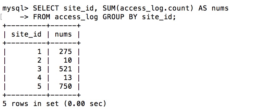 mysql> SELECT * FROM access_log; +-----+---------+-------+------------+ | aid | site_id | count | date | +-----+---------+-------+------------+ | 1 | 1 | 45 | 2016-05-10 | | 2 | 3 | 100 | 2016-05-13 | | 3 | 1 | 230 | 2016-05-14 | | 4 | 2 | 10 | 2016-05-14 | | 5 | 5 | 205 | 2016-05-14 | | 6 | 4 | 13 | 2016-05-15 | | 7 | 3 | 220 | 2016-05-15 | | 8 | 5 | 545 | 2016-05-16 | | 9 | 3 | 201 | 2016-05-17 | +-----+---------+-------+------------+ 9 rows in set (0.00 sec)