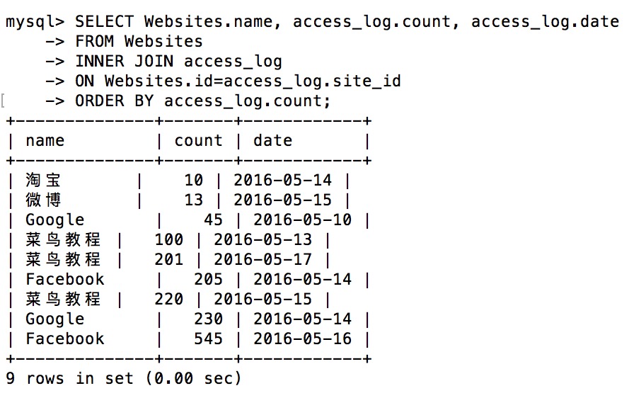 mysql> SELECT * FROM access_log; +-----+---------+-------+------------+ | aid | site_id | count | date | +-----+---------+-------+------------+ | 1 | 1 | 45 | 2016-05-10 | | 2 | 3 | 100 | 2016-05-13 | | 3 | 1 | 230 | 2016-05-14 | | 4 | 2 | 10 | 2016-05-14 | | 5 | 5 | 205 | 2016-05-14 | | 6 | 4 | 13 | 2016-05-15 | | 7 | 3 | 220 | 2016-05-15 | | 8 | 5 | 545 | 2016-05-16 | | 9 | 3 | 201 | 2016-05-17 | +-----+---------+-------+------------+ 9 rows in set (0.00 sec)