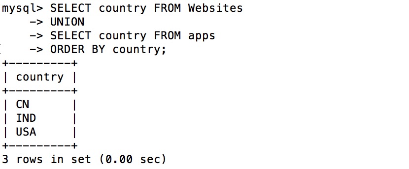 mysql> SELECT * FROM apps; +----+------------+-------------------------+---------+ | id | app_name | url | country | +----+------------+-------------------------+---------+ | 1 | QQ APP | http://im.qq.com/ | CN | | 2 | 微博 APP | http://weibo.com/ | CN | | 3 | 淘宝 APP | https://www.taobao.com/ | CN | +----+------------+-------------------------+---------+ 3 rows in set (0.00 sec)