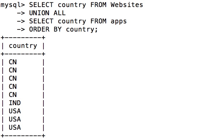 mysql> SELECT * FROM Websites; +----+--------------+---------------------------+-------+---------+ | id | name | url | alexa | country | +----+--------------+---------------------------+-------+---------+ | 1 | Google | https://www.google.cm/ | 1 | USA | | 2 | 淘宝 | https://www.taobao.com/ | 13 | CN | | 3 | 菜鸟教程 | http://www.runoob.com/ | 4689 | CN | | 4 | 微博 | http://weibo.com/ | 20 | CN | | 5 | Facebook | https://www.facebook.com/ | 3 | USA | | 7 | stackoverflow | http://stackoverflow.com/ | 0 | IND | +----+---------------+---------------------------+-------+---------+