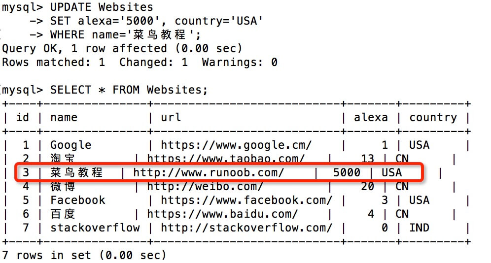 假设我们要把 "菜鸟教程" 的 alexa 排名更新为 5000,country 改为 USA。