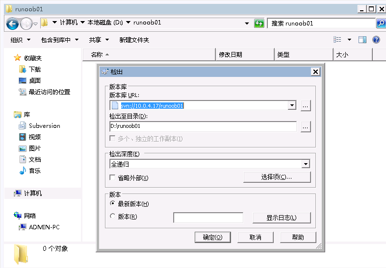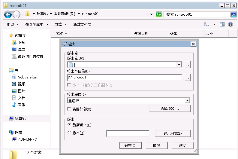 首先我们要填入的是 repository(版本库)的位置,对于 SVN 来说,repository 的位置都是 URL。版本库 URL 这里填入我们测试的版本仓库地址 svn://10.0.4.17/runoob01。