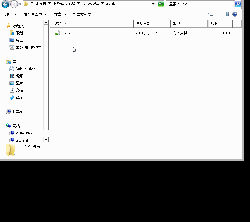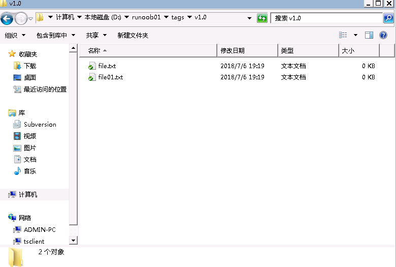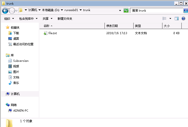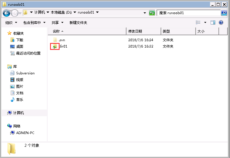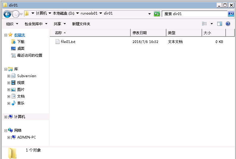 所谓的 runoob01 目录其实就是您平常用来存放工作档案的地方。通常我们会等到自己的工作做的一个段落的时候再进行备份。所以我们平常都是在 runoob01 目录下面工作,等到适当时机在 commit 到 repository 中。举例来说,我们想在 D 盘下面建立一个名为 runoob01 的目录。首先先把这个目录建立出来。