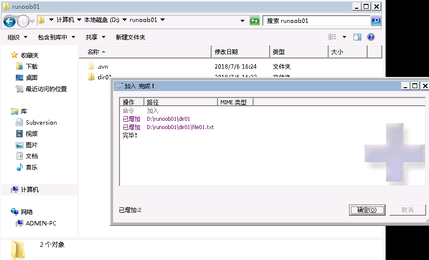 这个 Add(增加)的动作并未真正的将档案放到 Repository 中。仅仅是告知 SVN 准备要在 Repository 中放入这些档案。 此时的文件状态为: