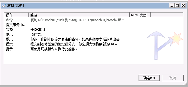 按下 OK 就可以关闭这个窗口了。如果您此时立刻去 runoob01 目录的 branch 子目录下面,您将会失望的发现在该目录下面并没有刚刚指定的目录存在。这是因为您 runoob01 目录的部份还是旧的,您只需要在 branch 子目录下面进行 SVN update 就可以看到这个新增的目录了。新增的目录就与原来的目录无关了。您可以任意对他进行编辑,一直到您确认好所有在 branch 下面该做的工作都完成后,您可以选择将这个 branch merge 回原来的 trunk 目录,或者是保留它在 branch 中。