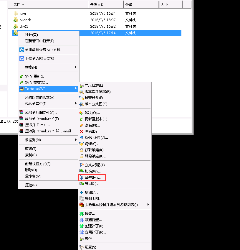 假如我们在 branch 分支中对文件进行了修改或增加了文件,要 merge 回 trunk 目录中,方法很简单。以上面的例子来说,我们在 D:\runoob01\trunk目录空白处,按下鼠标右键,选择 Merge(合并):