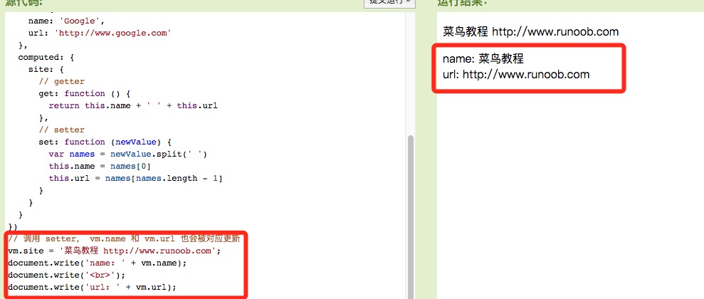 从实例运行结果看在运行 vm.site = '菜鸟教程 http://www.runoob.com'; 时,setter 会被调用, vm.name 和 vm.url 也会被对应更新。